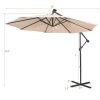 The patio umbrella comes with 8-rib structure and thickened metal pole coated with rust-resistant finish, showcasing excellent firmness and lasting using performance. 32 LED solar lights enables you to enjoy the night time with your family and friends in an atmosphere of relaxed informality. In addition, the tilting adjustment and hand-crank mechanism make sure efficient all-round sun protection. And the sun-protective fabric with high color fastness will block up extra sunlight while keeping fadeless. A weighted base (sold separately) is necessary to enhance stability while using. Detailed instruction and all accessories are given in the package, facilitating assembly. All in all, this hanging umbrella will be a practical decoration in various outdoor occasions.